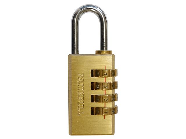The Faithfull Combination Padlock has a solid brass body with a 4-pin brass tumbler mechanism. It has a hardened and plated steel shackle encompassing a self locking action.