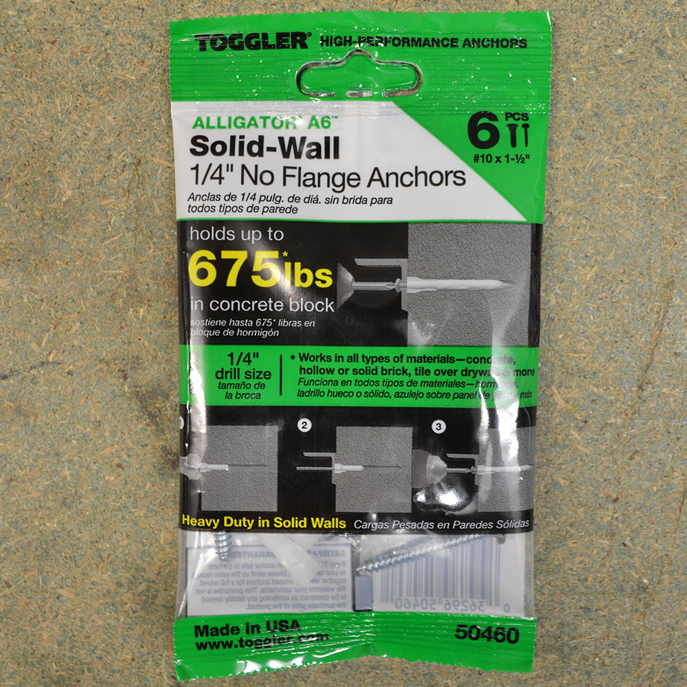 1/4″ no flange concrete wall anchors. These anchors are capable of holding up to 675*lbs in a concrete block. This fixing works in all types of material such as: concrete, hollow or solid brick, tile over drywall and more.